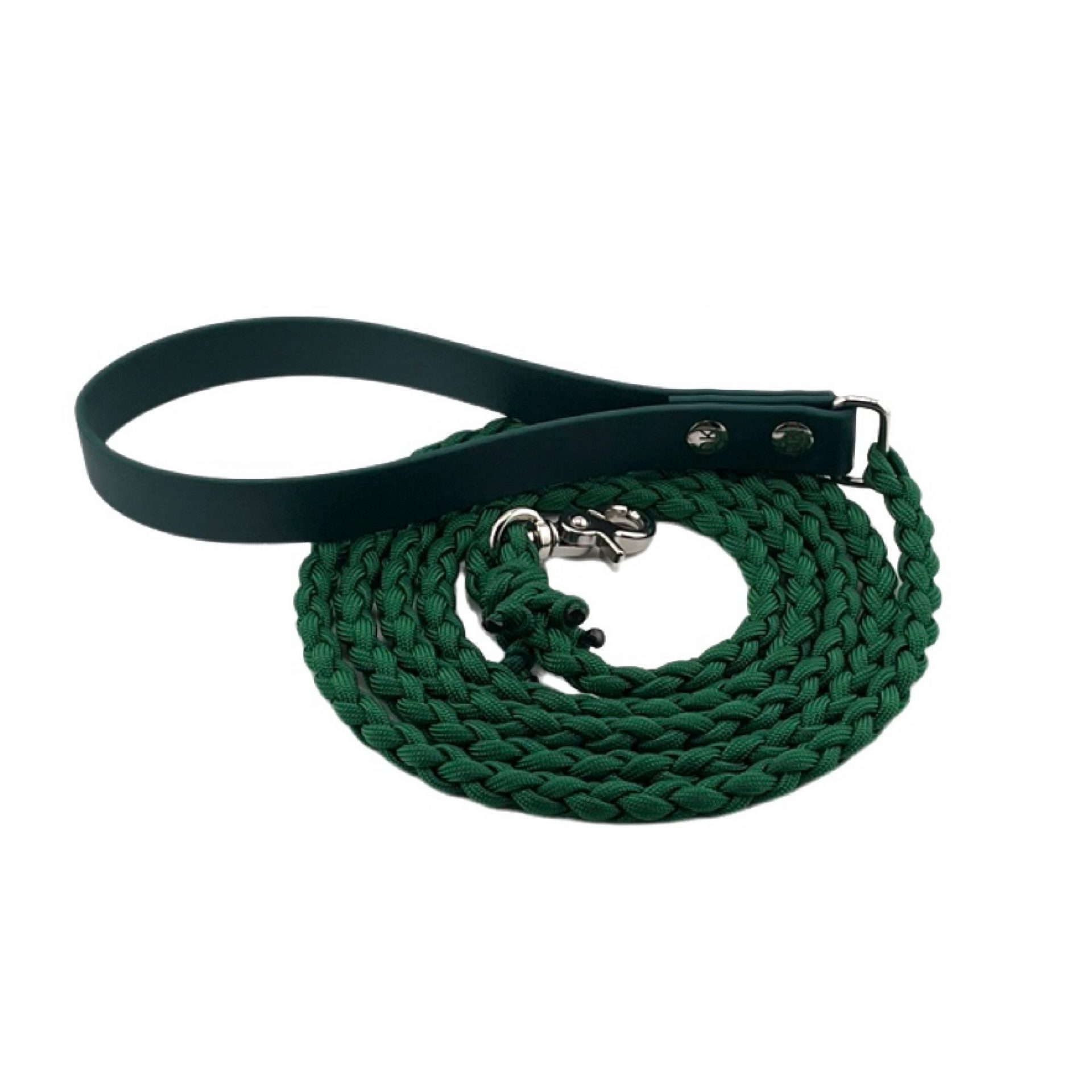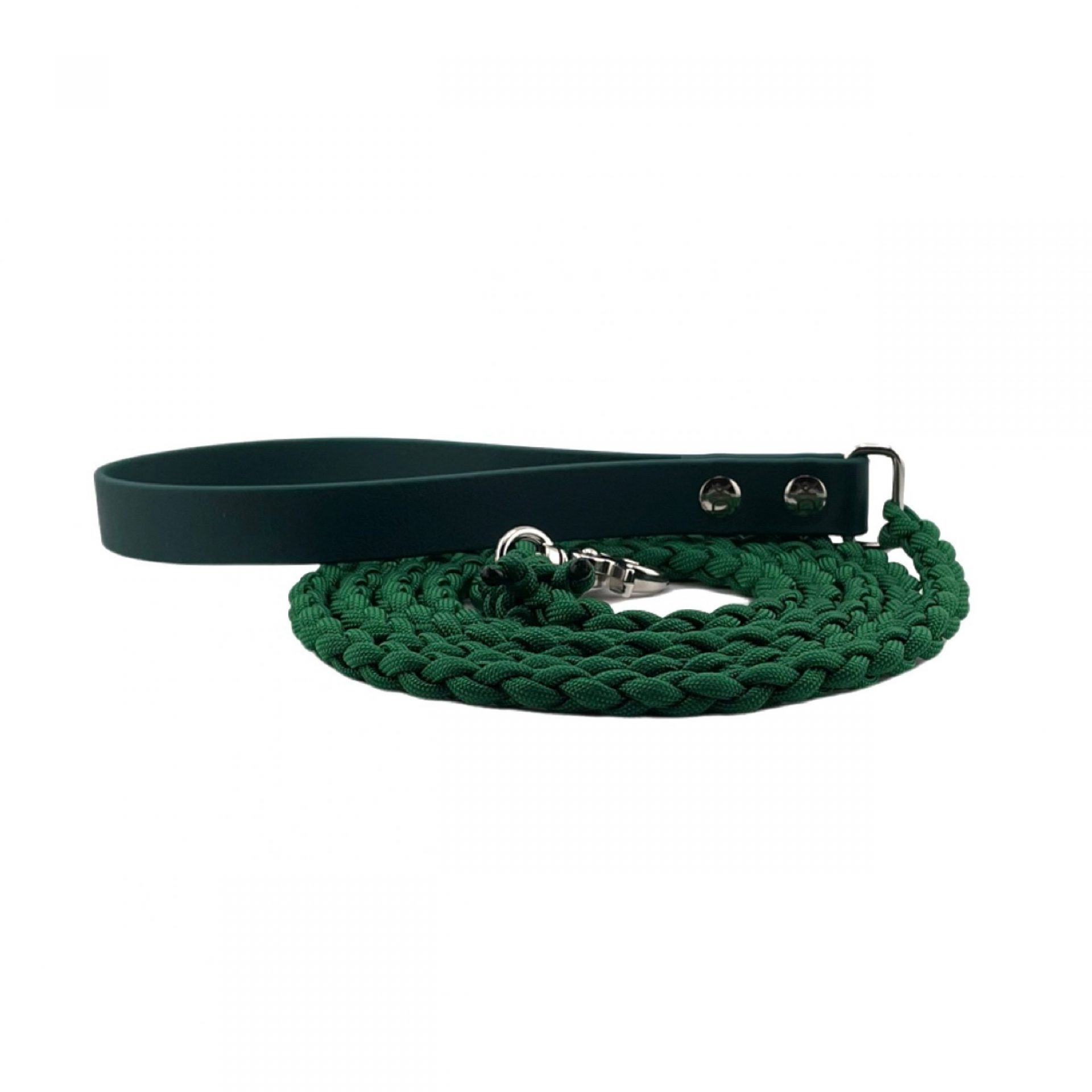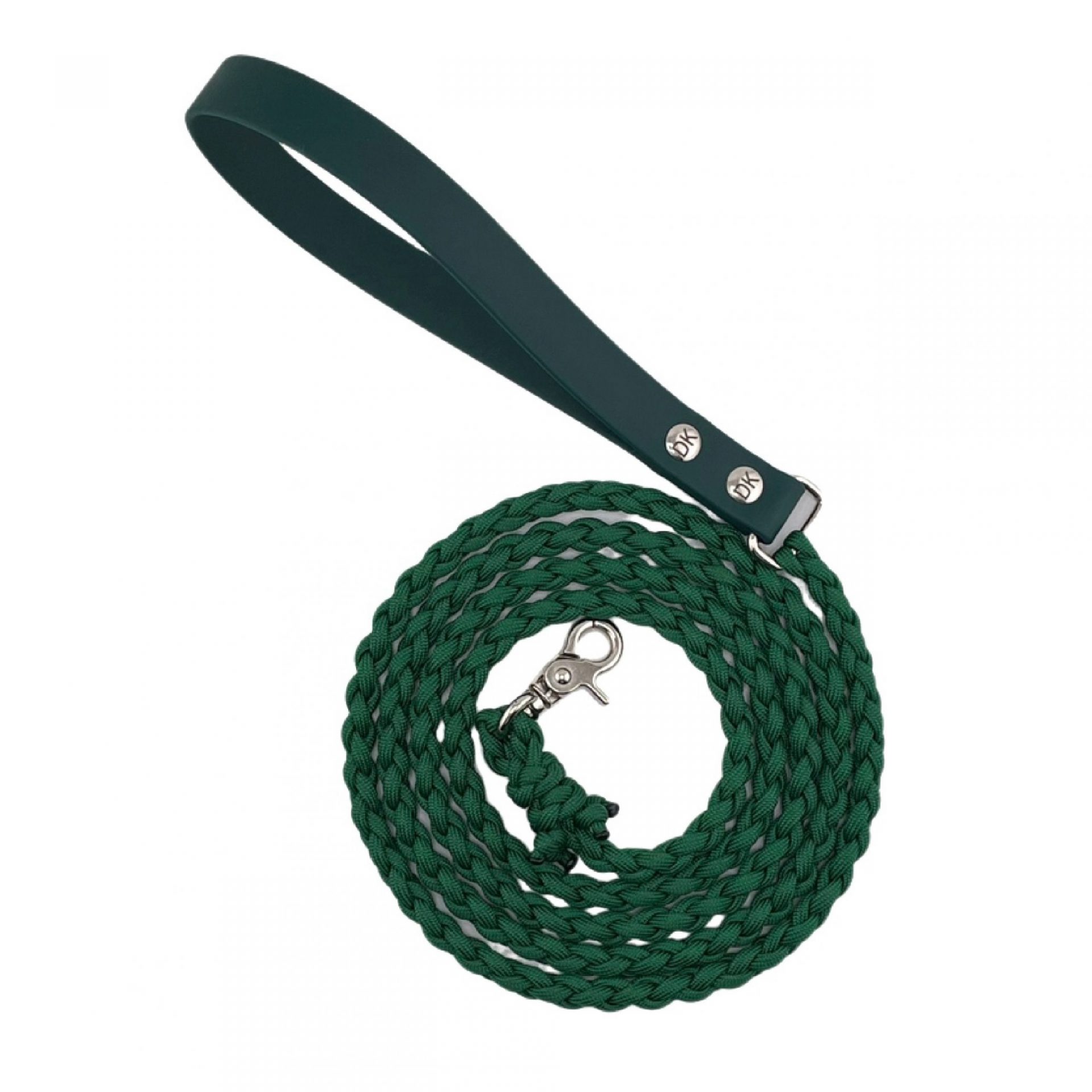 Unsere Paracordleine DK „Green“ 2-Strang verbindet das strapazierfähige und robuste Design von Paracord mit der schlichten Eleganz von Biothane. Die Handschlaufe aus Biothane ermöglicht eine sichere und komfortable Führung deines Hundes. Biothane ist wasserfest und resistent gegenüber Schmutz und Feuchtigkeit. Das macht es besonders geeignet für den Einsatz im Freien und bei allen Wetterbedingungen. Die glatte Oberfläche von Biothane macht es einfach, diese zu reinigen. Man kann Schmutz oder Schlamm leicht abwischen. Biothane ist im Vergleich zu einigen anderen Materialien sehr leicht, was den Komfort für deinen Hund und dich verbessert. Die Leine ist nicht verstellbar und in der Gesamtlänge inkl. Schlaufe ca. 1,85 m lang (ohne Schlaufe ca. 1,65 m). Jede Leine von uns wird für dich in 100 % Handarbeit hergestellt.