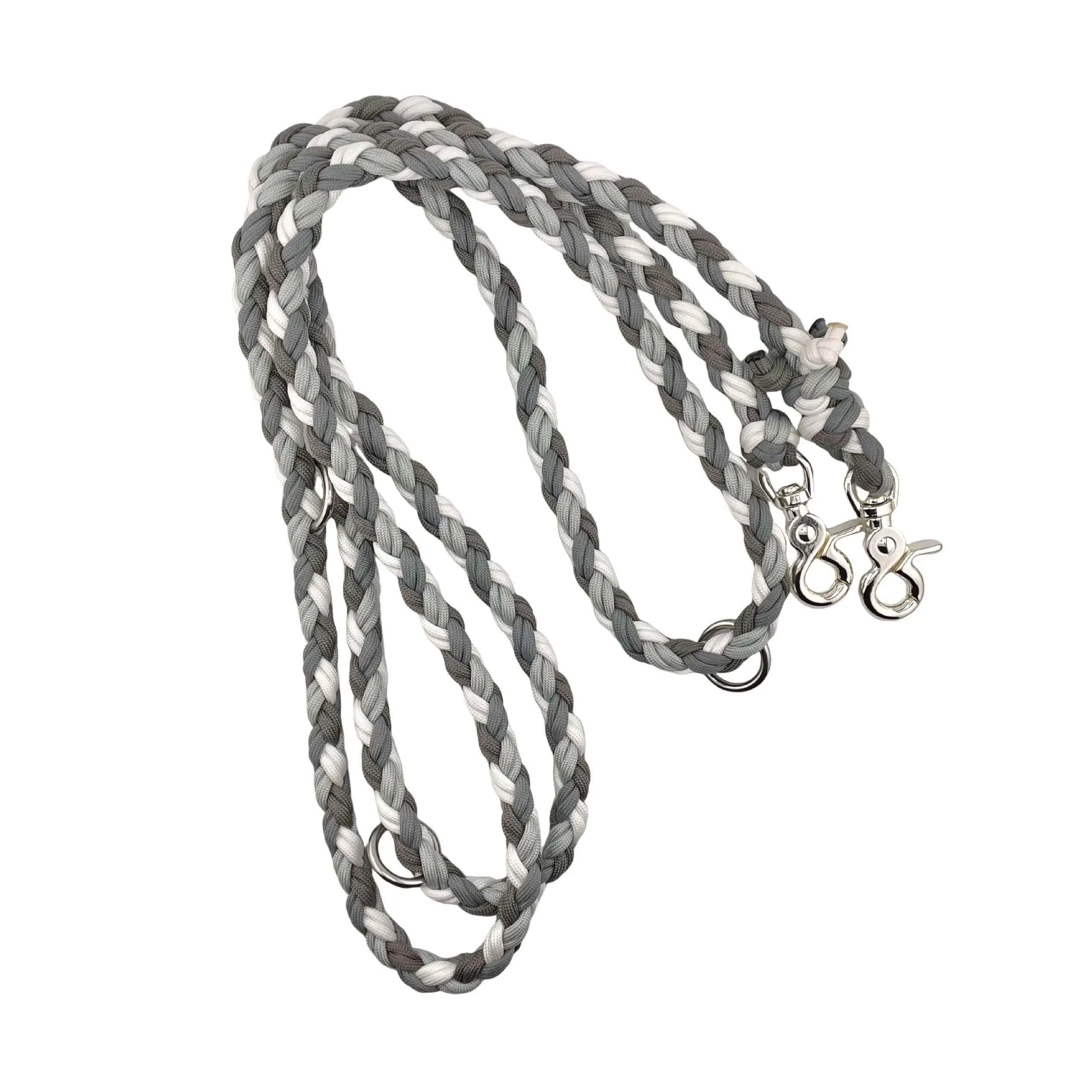 Mit unserer Paracordleine Glow „Three Shades of Grey“ 4-Strang ziehst du mit Sicherheit alle Blicke auf dich – denn deine Leine leuchtet im Dunkeln, ohne mit einer Lichtquelle oder Batterie verbunden zu sein. Am Tag besticht die Leine durch ihr schönes Design und in der Nacht zeigt sie dir genau, in welche Richtung deine Fellnase läuft. Du benötigst also keine lästigen Leuchthalsbänder oder Tags mehr, die deinen Vierbeiner irritieren können, wenn diese zu dicht am Kopf platziert werden oder am Halsband hin und her baumeln. ​​Die Leine ist 3-Fach verstellbar (1,4 m / 1,8 / 2,20 m) und in der Gesamtlänge ca. 2,50 Meter lang. Hinweis: Die Leine muss erst durch eine Lichtquelle aufgeladen werden, bevor sie leuchten kann – je länger und intensiver, desto stärker ist die Leuchtkraft.