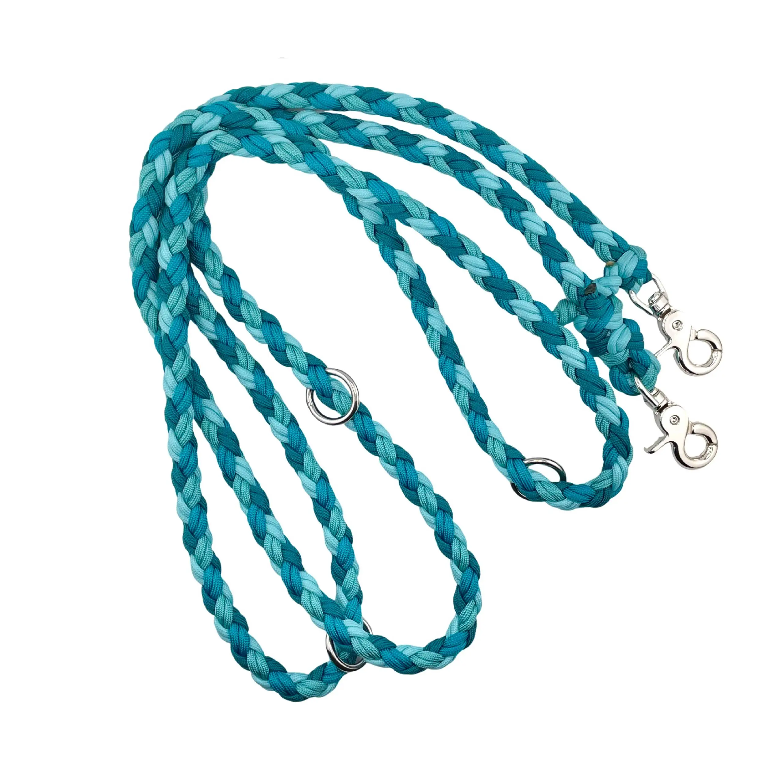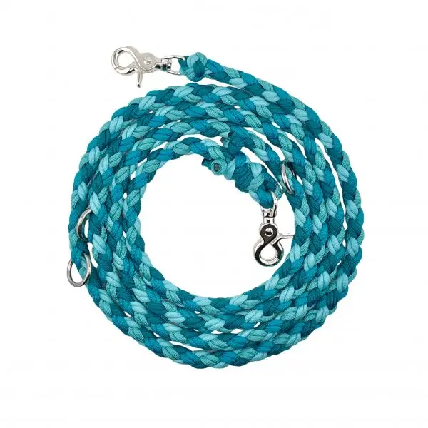 Mit unserer Paracordleine Glow „Turquoise“ 4-Strang ziehst du mit Sicherheit alle Blicke auf dich – denn deine Leine leuchtet im Dunkeln, ohne mit einer Lichtquelle oder Batterie verbunden zu sein. Am Tag besticht die Leine durch ihr schönes Design und in der Nacht zeigt sie dir genau, in welche Richtung deine Fellnase läuft. Du benötigst also keine lästigen Leuchthalsbänder oder Tags mehr, die deinen Vierbeiner irritieren können, wenn diese zu dicht am Kopf platziert werden oder am Halsband hin und her baumeln. ​​Die Leine ist 3-Fach verstellbar (1,4 m / 1,8 / 2,20 m) und in der Gesamtlänge ca. 2,50 Meter lang. Hinweis: Die Leine muss erst durch eine Lichtquelle aufgeladen werden, bevor sie leuchten kann – je länger und intensiver, desto stärker ist die Leuchtkraft.
